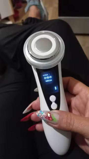 Masseur facial LED multifonction, rajeunit et raffermit la peau grâce à la technologie LED, EMS, et massage vibrant. Stimule la circulation, nettoie les impuretés et aide à réduire les rides pour une peau éclatante et ferme.